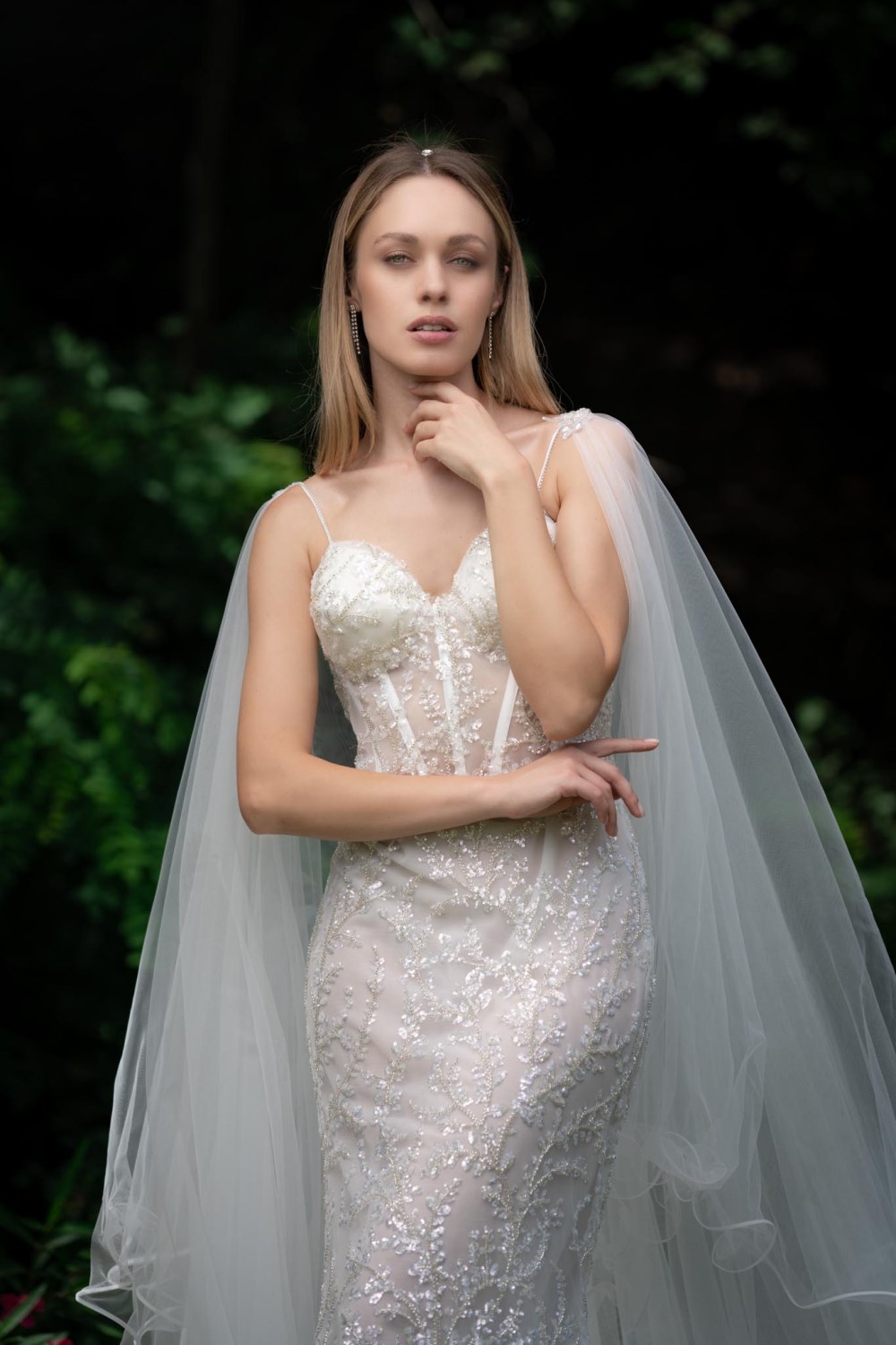 L'abito a sirena Magnani Bridal Couture esalta la bellezza e l'eleganza della sposa e delinea perfettamente le forme del corpo. Il corpetto in tulle semitrasparente crea seducenti contrasti ed è impreziosito con un triplo strato di tulle leggero e impalpabile. L'abito a sirena è interamente decorato con del pizzo ricamato che forma delicati fiorellini. Il ricamo floreale viene evidenziato con la presenza di piccoli punti luminosi, per una sposa che vuole risplendere e catturare l'attenzione nel giorno più importante della sua vita. Per delineare la figura e rendere il vestito leggero e sofisticato, è stata creata una sottile bordatura che crea un piacevole effetto arricciato. Il modello a sirena Magnani Bridal Couture è di fattura artigianale, ed è adatto per le spose che amano lo stile romantico e i tessuti leggeri e raffinati. Il corpetto con scollatura a cuore presenta una morbida e leggera imbottitura in prossimità del seno, che realizza un perfetto contrasto cromatico con il tulle ricamato. Per completare l'abito da sposa si può aggiungere un velo sulle spalle in tulle con bordatura in raso che crea una particolare arricciatura e lascia ben visibile la parte anteriore del vestito.